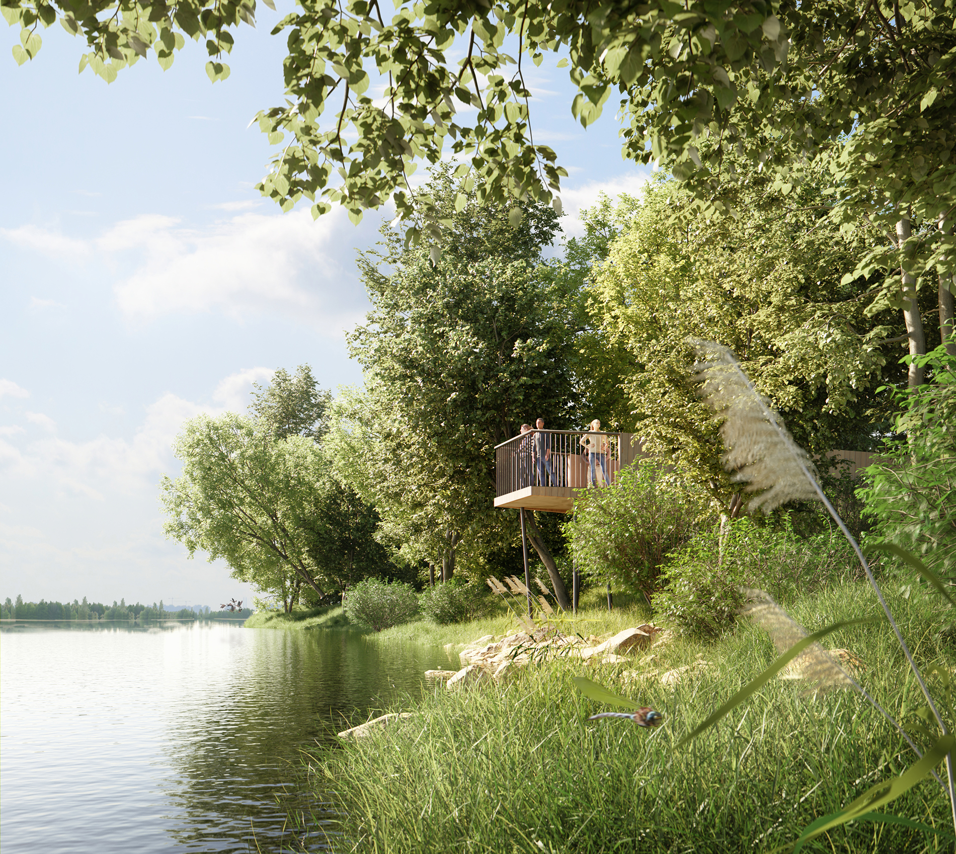 W północnej części parku zaplanowano intensywną strefę rekreacyjną z pumptrackiem, boiskami sportowymi, placem zabaw oraz ogrodzonym wybiegiem dla psów. Ścieżki prowadzą do małych ogrodów sensorycznych oraz strefy piknikowej, a także plaży z hamakami i leżakami. Ścieżka prowadząca od nowoprojektowanych osiedli do bulwaru na wale przeciwpowodziowym przechodzi w subtelną kładkę pieszą, prowadzącą do naturalnej części parku, oferując spokojne miejsca do obserwacji przyrody. Projekt zakłada także utworzenie drewnianych kładek pieszych i punktów widokowych, umożliwiających kontrolowany dostęp do cennych przyrodniczo obszarów, takich jak łęgi, łąki kwietne i wiklinowiska nad Wisłą. Działania te mają na celu połączenie ludzi z naturą, umożliwiając jednocześnie ochronę i rozwój lokalnych ekosystemów